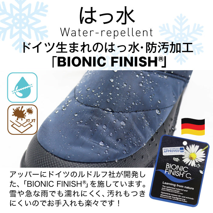 「BIONIC FINISH」は、ドイツのルドルフ社のはっ水・防汚加工で水や汚れを強力に弾きながら、