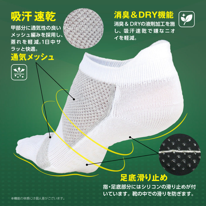 指・足底部分にはシリコンの滑り止めが付いています。靴の中での滑りを防ぎます。
