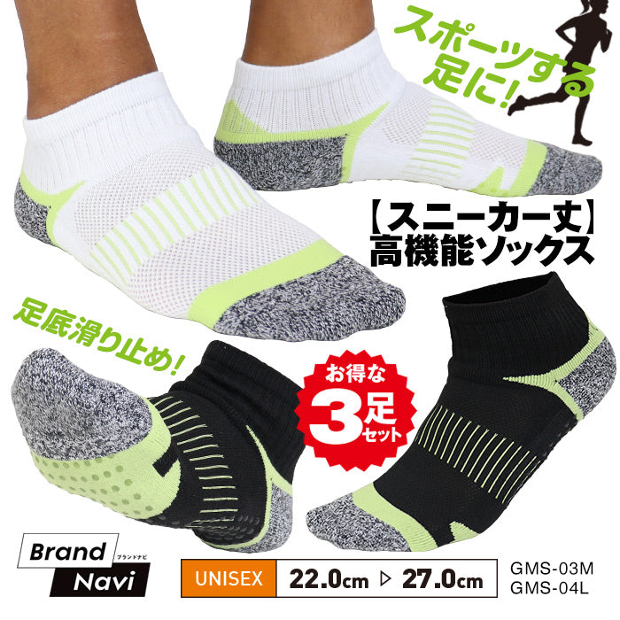 ユニセックス お得な3足セット 滑り止め付き スニーカー丈 機能性ソックス by ジームード / Sneaker sports socks GMS-03M GMS-04L
