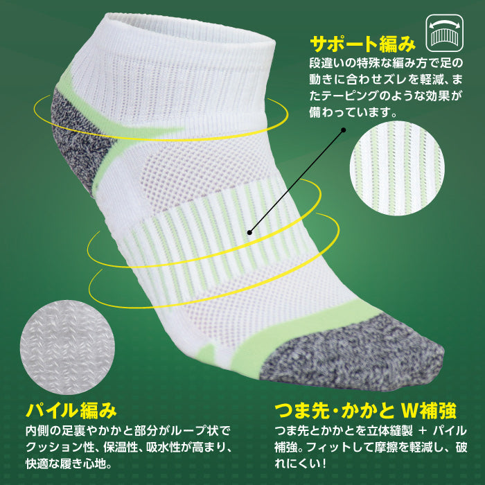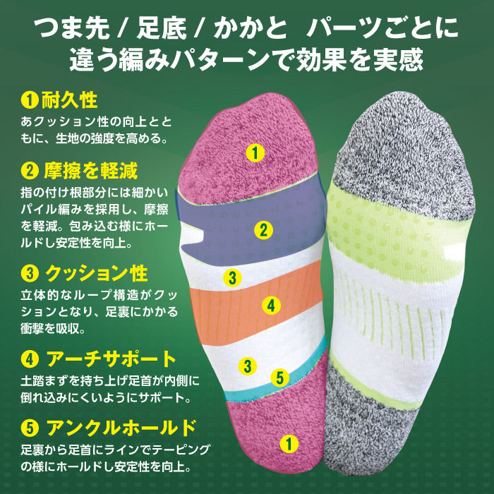 ・耐久性・摩擦の軽減・クッション性・アーチサポート・アンクルホールドなど5パターンの機能的な編み方を使い分けています。