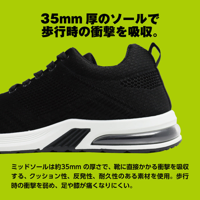 ミッドソールは約35mmの厚さで、靴に直接かかる衝撃を吸収する、クッション性、反発性、耐久性のある素材を使用。